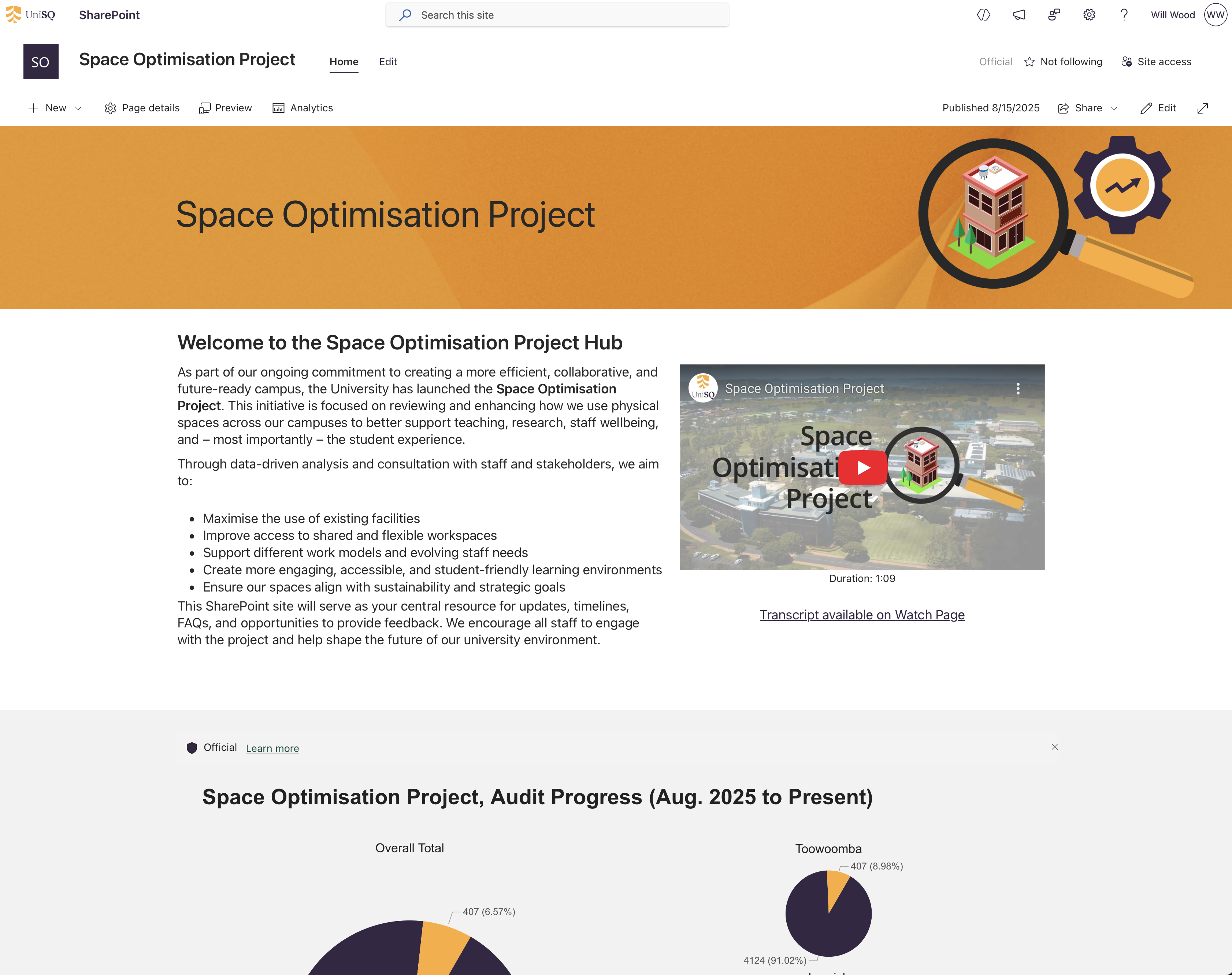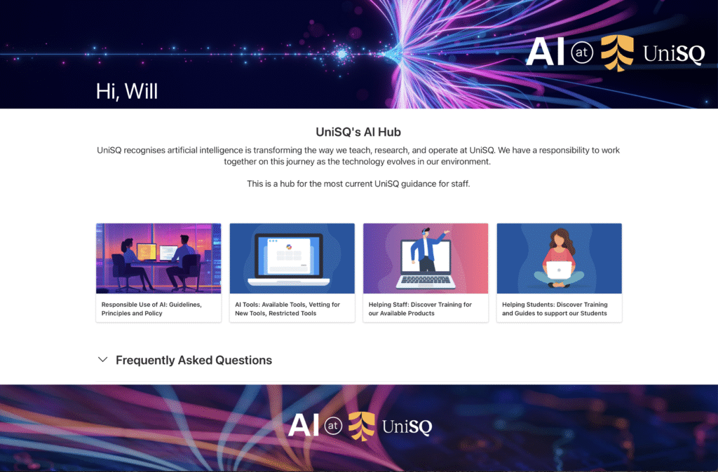 Working with internal ICT stakeholders in Digital Workplace, the Director (ICT Operations) and others, I developed the layout, design and skin for the AI@UniSQ site to ensure its style enveloped the innovation and emergent-tech themes of the artificial intelligence. This included leveraging the affordances of the web components of SharePoint to ensure a clean, personalised experience, as well as sourcing and tailoring a suite of graphics to highlight the emergent nature of this technology, while aligning and embedding the University’s branding guidelines.